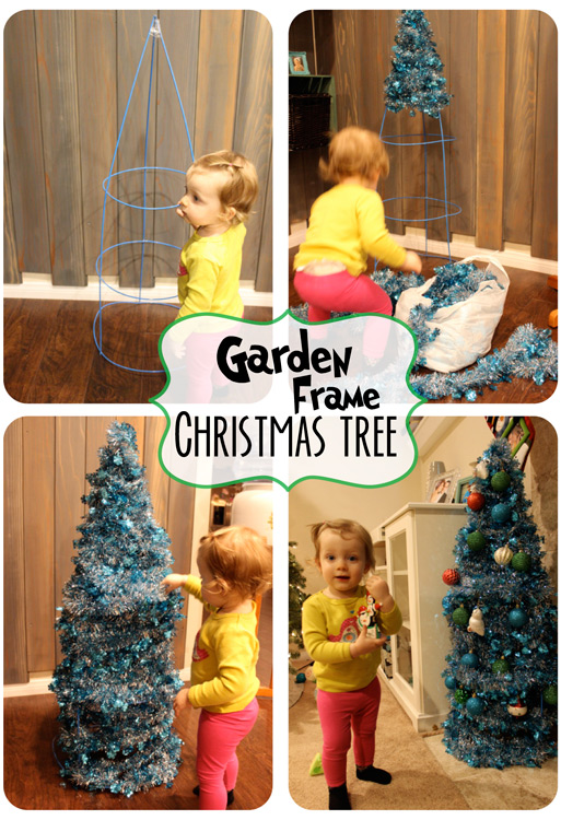 This garden frame garland Christmas tree is such an easy way to add a little bling to your living room and it was super easy to make. Anyone who saw my previous post on felt Christmas tree for Scarlett knows that I wanted to have a homemade crafty tree just for her. Unfortunately my husband was a) not keen on the idea of storing a construction cone in the garage all year and b) not a fan of me stealing construction cones from work sites with Scarlett in the car (so if I was by myself it would be ok?!). So I found this awesome idea from Tinysidekick Garland Tree Tutorial and was thrilled that I already had a garden frame and garland. Free mini tree! Scarlett had tons of fun helping me put this tree together as well. I would recommend using a frame like the one Tinysidekick used if you are buying one since mine was not really evenly proportioned. Oh well, it was free. Grows my tomatos in summer and acts as a toddler mini Christmas tree in winter. Sweeeeeeet.