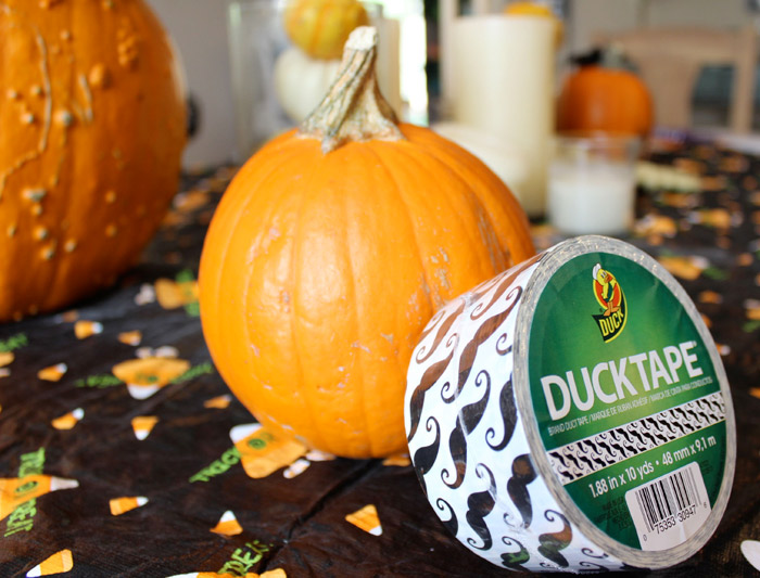 Pretty straight forward. You simply roll the tape around the pumpkin.. easy easy easy. Michaels now carries a whole section of duck tapes. Tons of colors and patterns to choose from. A roll is 4.99 so I use my iphone app to get 40% off since I think that is too expensive for a roll of tape.