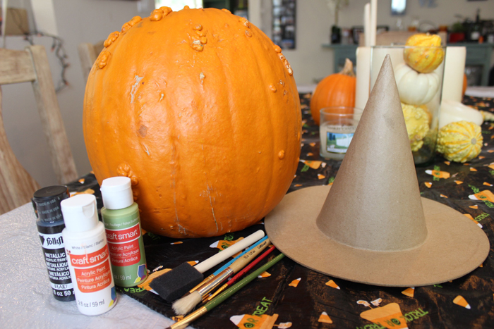 Simple, easy, fun. All you need is acrylic paint and paint brushes! My husband was annoyed that I picked such a warty pumpkin so I found this hat on clearance at the craft store and painted a witch!