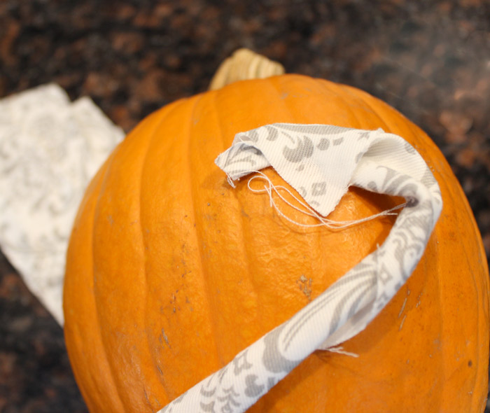 This was an after thought but I really liked how it turned out! I had left over strips of fabric that were pre cut for the mod podge pumpkins. I simply hot glued the end of the strip to the pumpkin then twisted it around and continued to glue it down in different spots as I twisted it in a circle. At first I was trying to make it look really nice but quickly realized it was not possible and now I love how it looks a little bit messy and organic. Or maybe Im just making myself feel better about perfection failure.