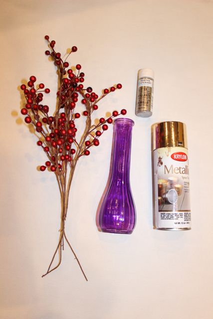 Next I took a vase I bought at the dollar store and gave it a spray along with a little glitter paint. Then I stuffed some holly berry into it that I got at the thrift store. There was TONS of holly berry at the thrift store, you do not need to get this stuff at the craft store, go thrifting!
