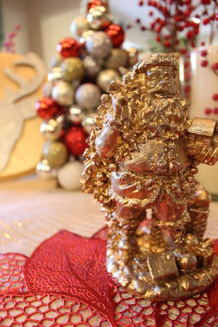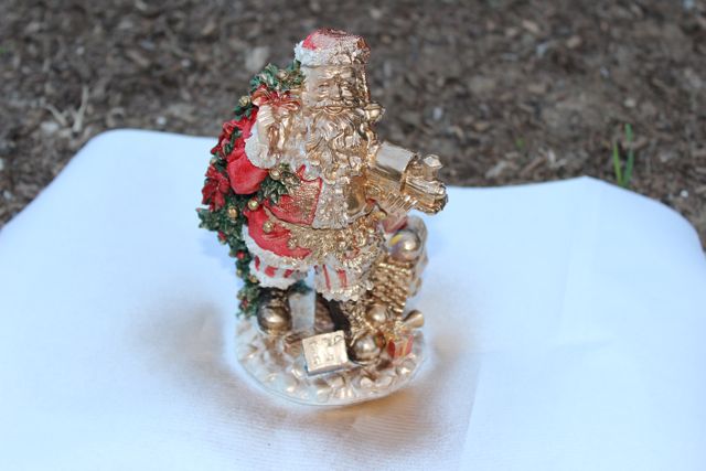 I was looking for deer but the thrift store was slightly limited when it came to tacky porcelain figurines this Christmas so I settled on Santa. It’s simple, just take any porcelain figurine from thrift store or yard sale and spray paint it gold, white or silver and voila, instant decoration that matches your decor!