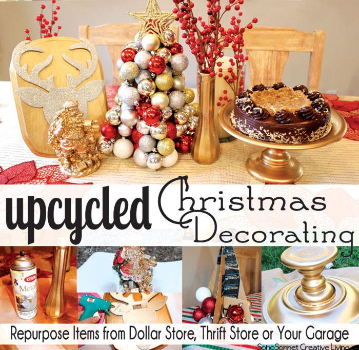 If you are looking for a fun, cheap and easy way to decorate your table for Christmas then you have come to the right place! In this post I will show you some really simple tricks to use budget items from the thrift store, your garage and the dollar tree store and make them fabulous for your Christmas decorating. It is called upcycled Christmas decorating, using things that are mediocre and making them magnificent! (Ok ok, I wouldn’t go that far). This Christmas I am on a really tight budget and looking for ways to save…. ENTER… METALLIC SPRAY PAINT! I went a little spray paint crazy but hey, what woman doesn’t love gold?