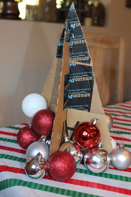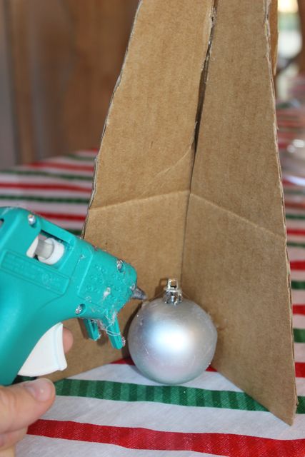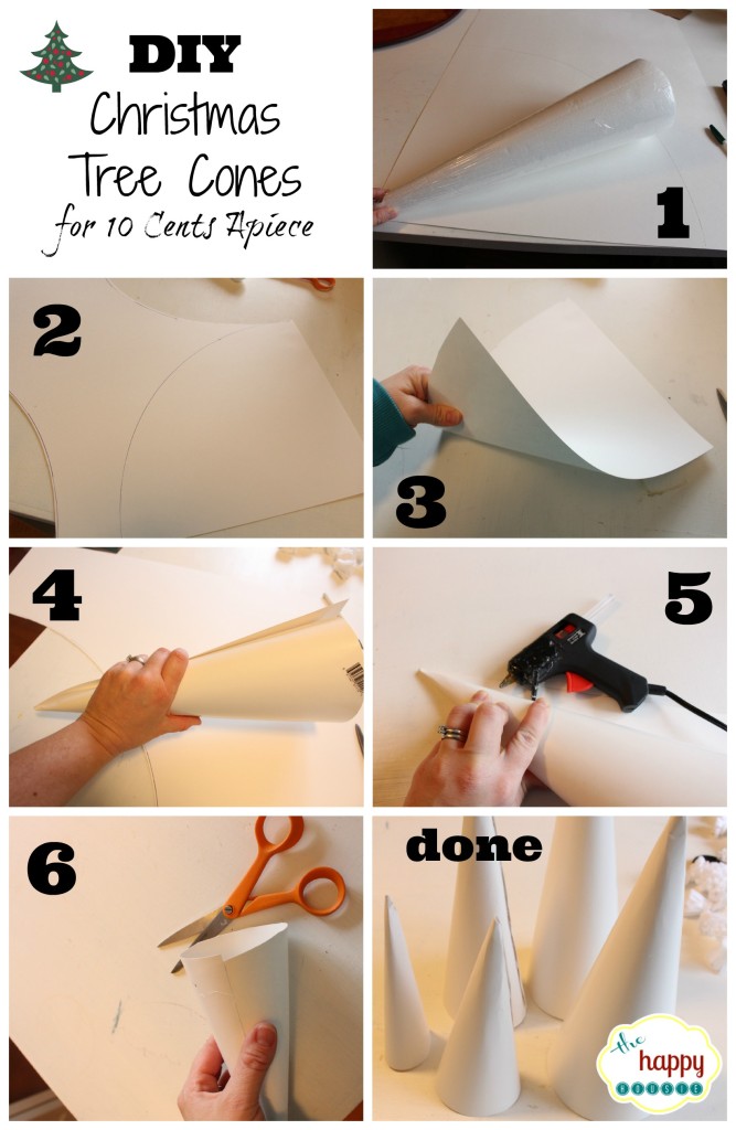 I actually wanted to buy Paper Mache cones from the craft store to do this project, they are only $1.79 for taller ones at Michaels but they were SOLD OUT. Bummer. So I improvised and made a form out of cardboard box. This did work, but I had to use A LOT more bulbs. 5 packages from the dollar tree store. I suggest making a cone shape out of poster board like this (thank you to The Happy Housie) and then using less bulbs.