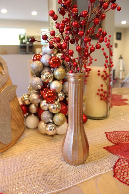 If you can see behind the vase in the below picture I also stuffed some holly berry into my candle jars. So that’s it! My super budget centerpiece upcycling items from the thrift store, dollar store and my garage. Merry Christmas!