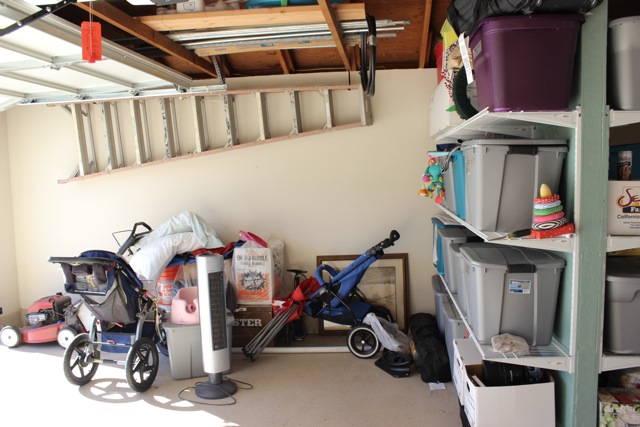 Below is a picture of our garage. I wanted the BIG space where the ladders are hanging are but my husband did not want to move his precious ladders and did not want me taking over the “main” garage space so I ended up with the tiny wall in the laundry area. No problem, challenge accepted.