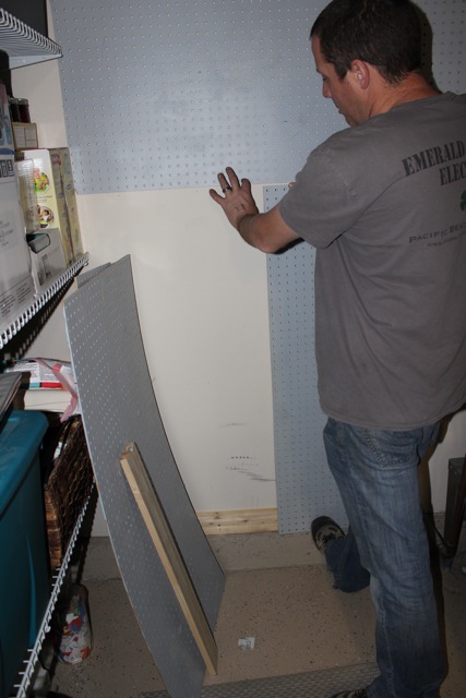 I tried to put up the peg board myself but apparently you cannot just screw it into the wall. After proudly showing my husband my work he shook his head, rolled his eyes and jumped in to re-do the job. He put some wood boards at bottom and top of the boards to create a space between the board and the wall.
