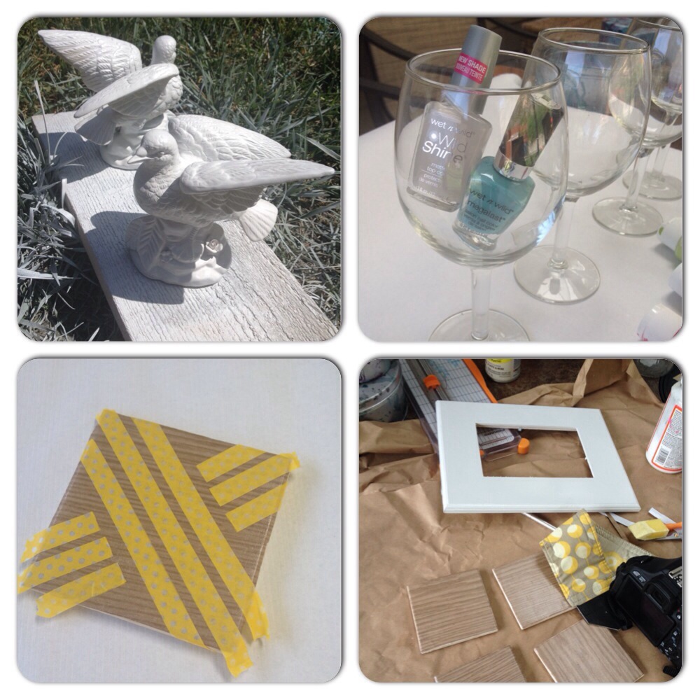 I found these birds at the thrift store and knew that I had to do something with them! Nail polish and wine glasses? Well if anyone saw my marbled coffee cup post you would know that nail polish and clear gloss spray create a dishwasher safe glass finish… so I will let you guess what is going to happen to these. You can already see a sneak peak of my finished coaster above but you will never guess how I made these, it’s easier then you think.